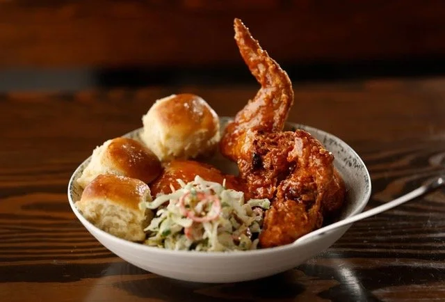 The Crack Shack’s fried chicken, slathered in honey garlic butter, accompanied by their classic slaw and biscuits. Photo for The San Diego Union-Tribune by K.C. Alfred.
